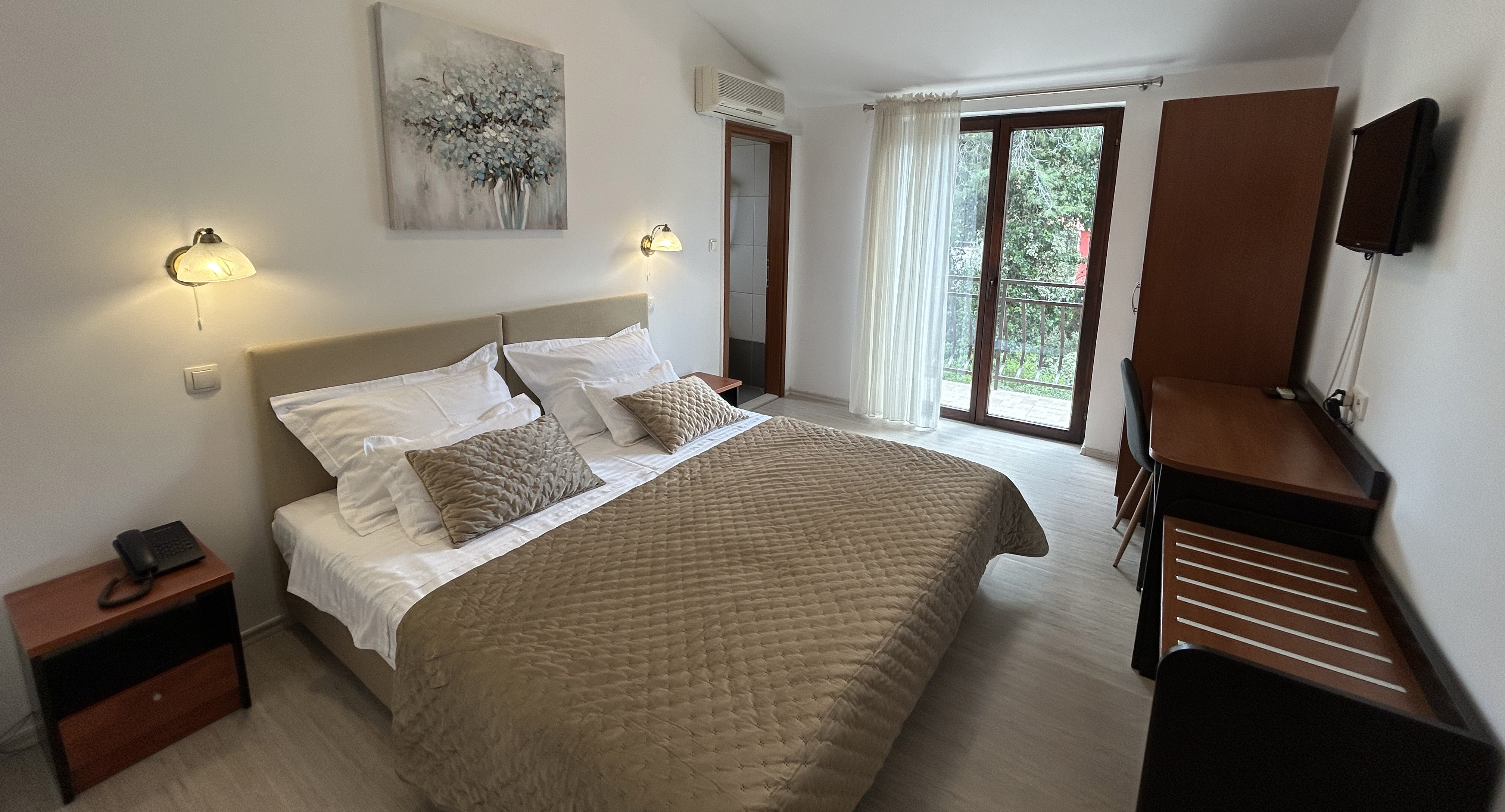 Standard rooms can be with a double bed or separate beds. Each room has a balcony, some of which have a side view of the sea.